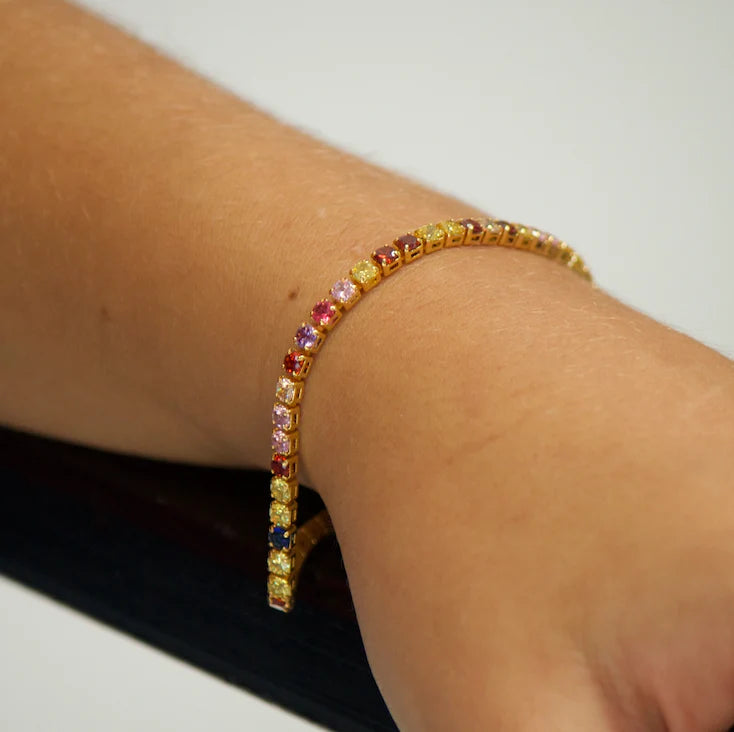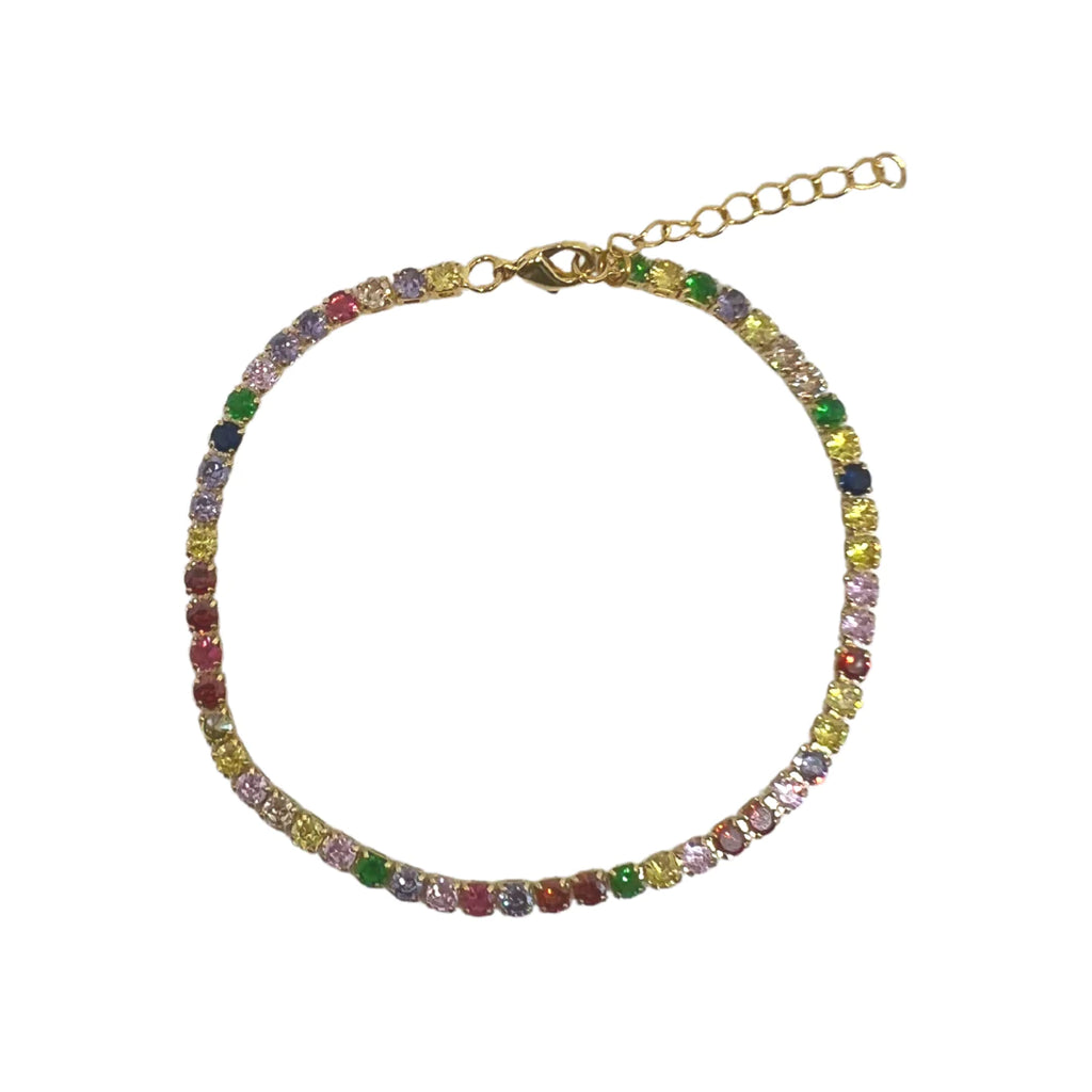 This bracelet is 7.5 inches long with a 0.5 inch extender. The chain is made from a collection of multi-coloured cubic zirconia stones embedded on a 14k gold plated brass chain