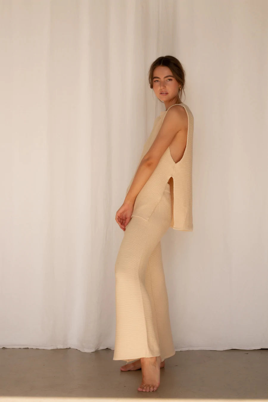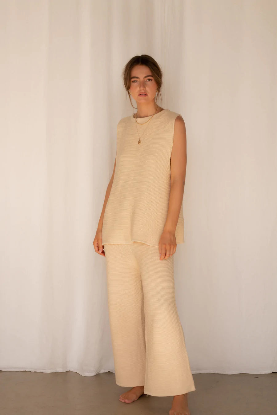 Our Sadie-Bloom Pant is made in a beautiful Buttermilk colour-way in our new French Knit. This style features an elastic waist and fits loosely through the legs for a straight- wide fit. This shape is perfect for any season and super easy to style.
